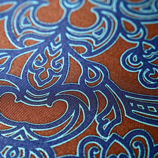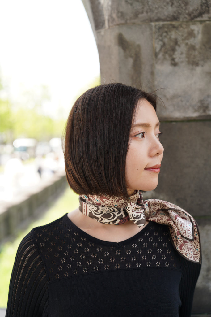 弊社のスカーフは、横濱に長く伝わる伝統技法「手捺染(てなっせん)」によって、熟練の職人が一点ずつ丁寧に染め上げたもの。微細な濃淡や自然なムラ感、手仕事でしか表現できない表情が魅力です。