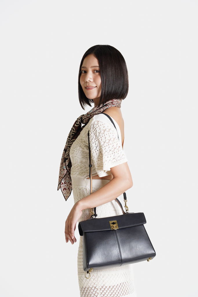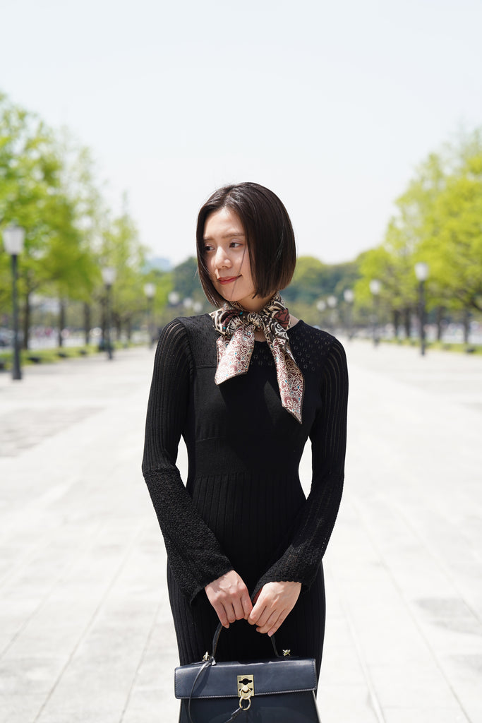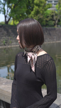 使用しているのは、高級ブランドにも匹敵する厚手のシルク生地。しっかりとしたハリと自然な重みを備えたこの素材は、巻いた瞬間に立体的なドレープを生み出し、首元に構築的なシルエットと深みを与えます。 光を抑えたマットな質感の中にほんのりと艶が宿り、落ち着きのある華やかさが際立ちます。