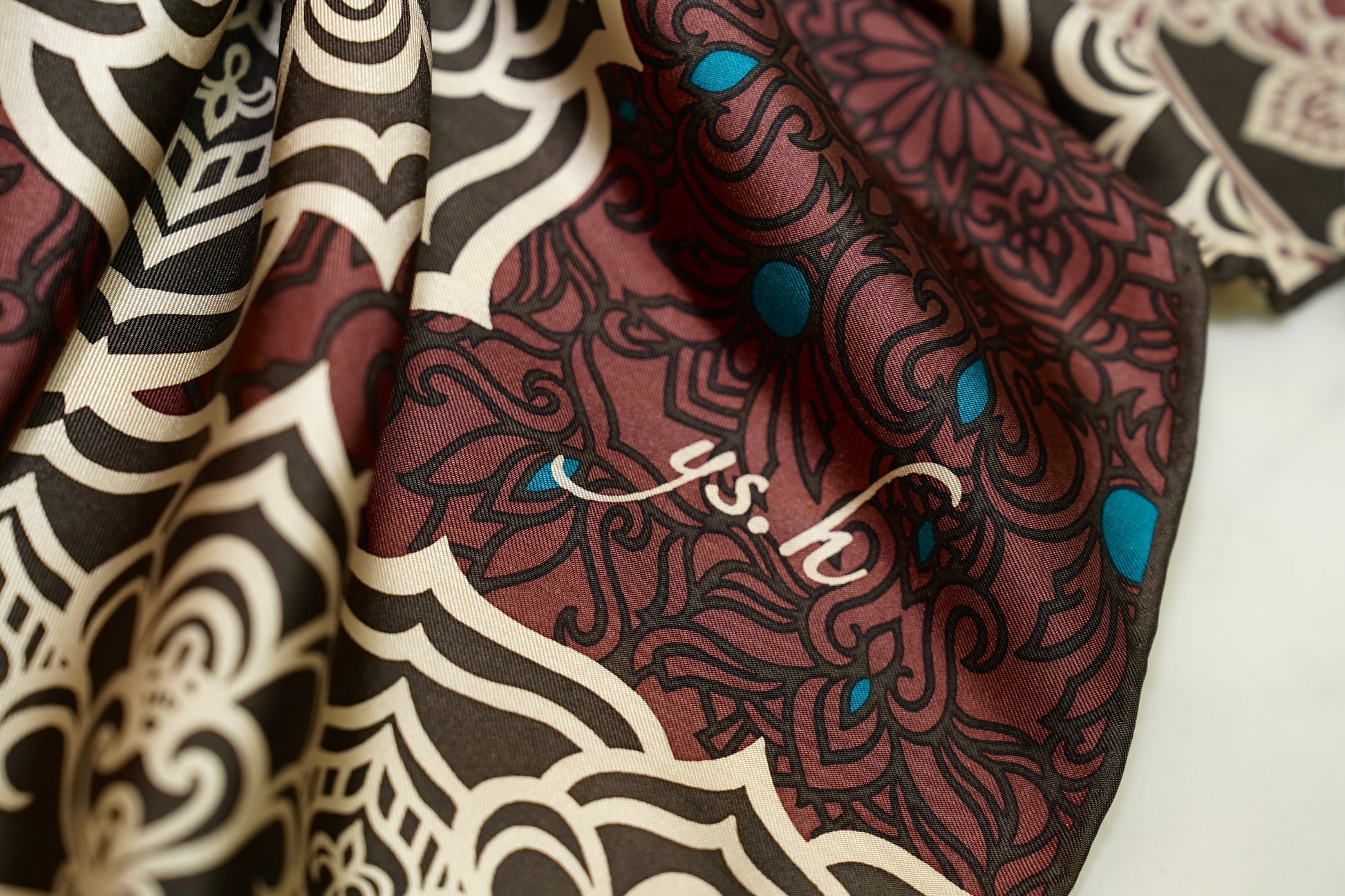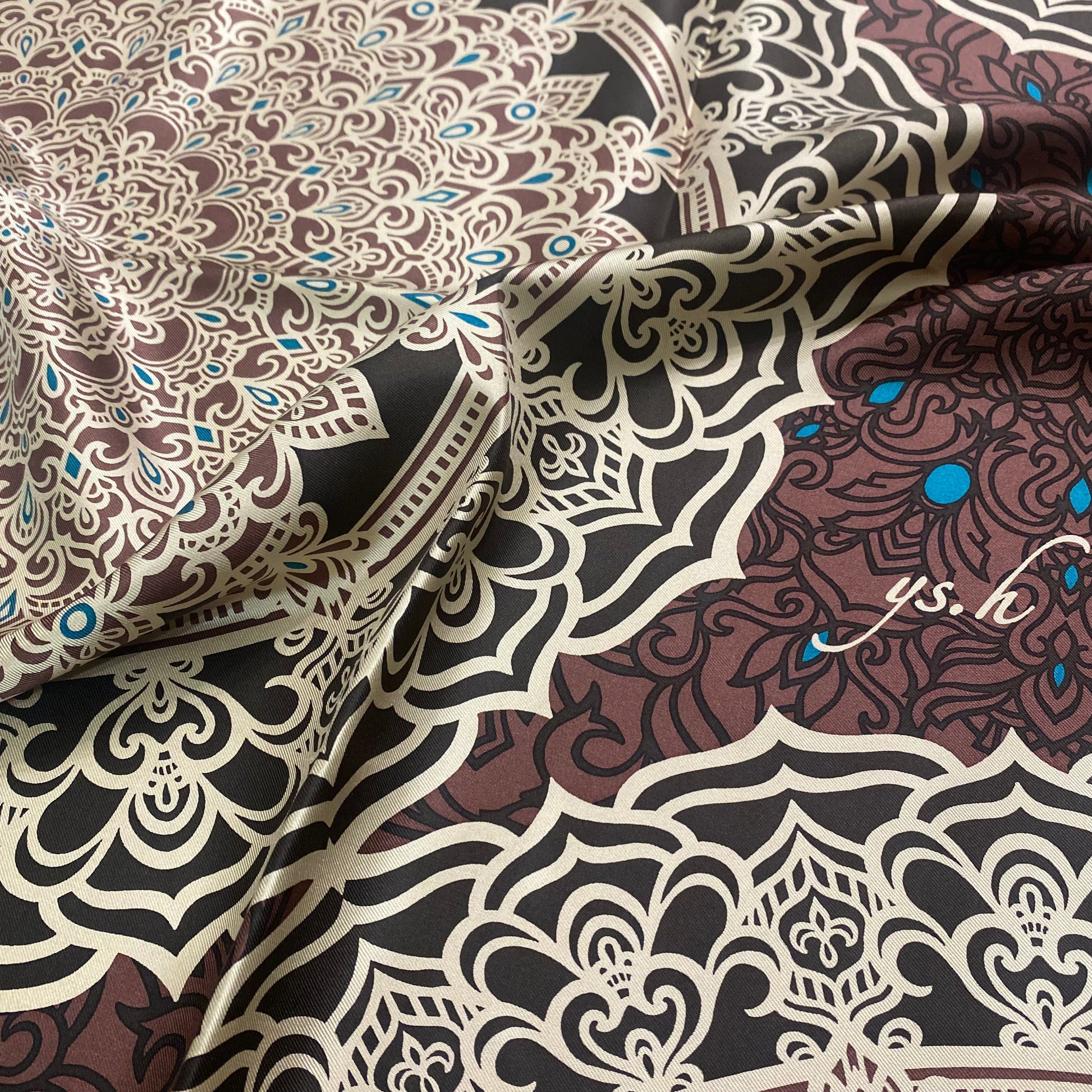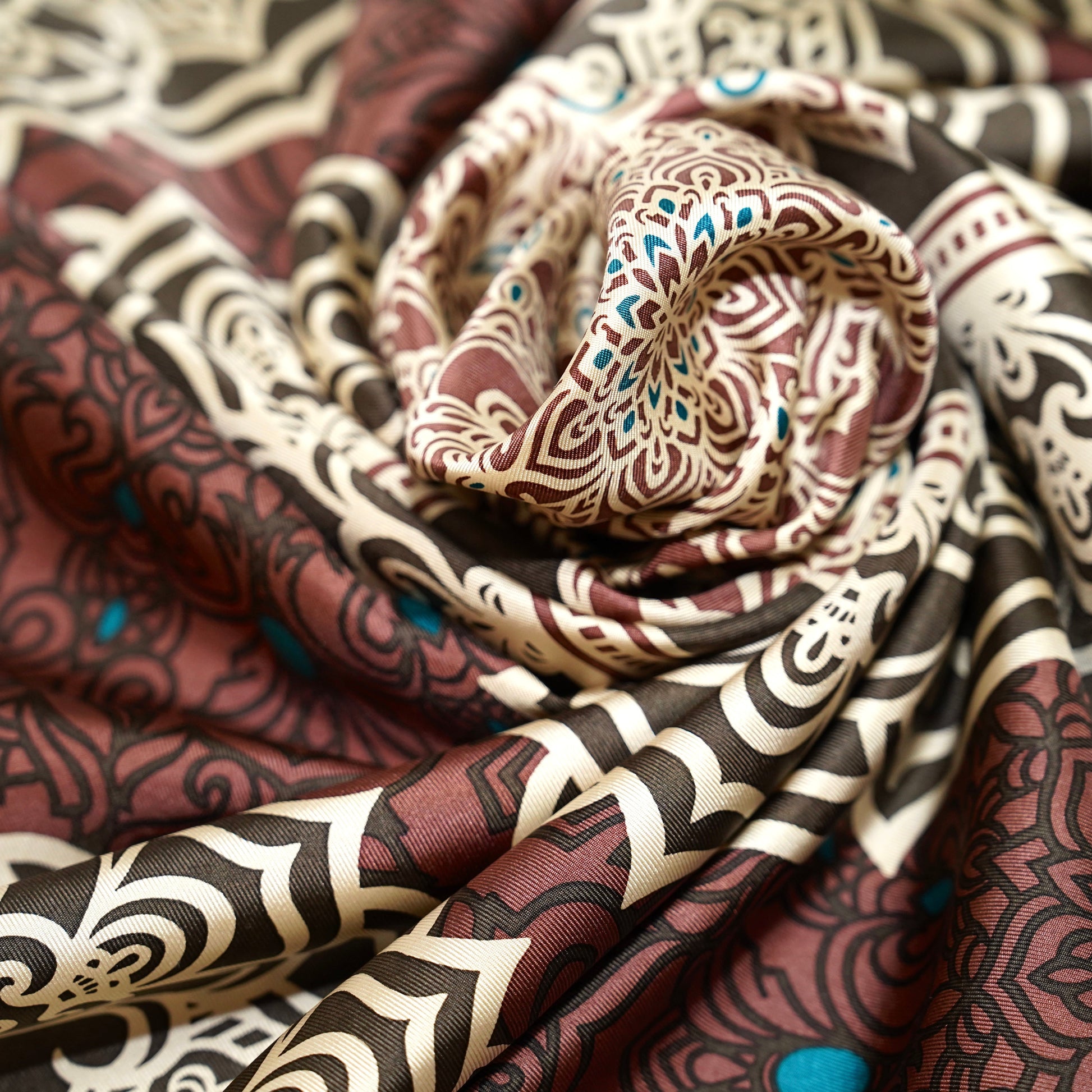 【AMIRA〈アミーラ〉】は、「王女」の名にふさわしく、品格と華やかさを併せ持つブラウンスカーフ。 中東の宮殿のような装飾美をイメージした色調と存在感は、装いに気高くしなやかな輝きを添え、クラシックかつ都会的な印象を与えます。